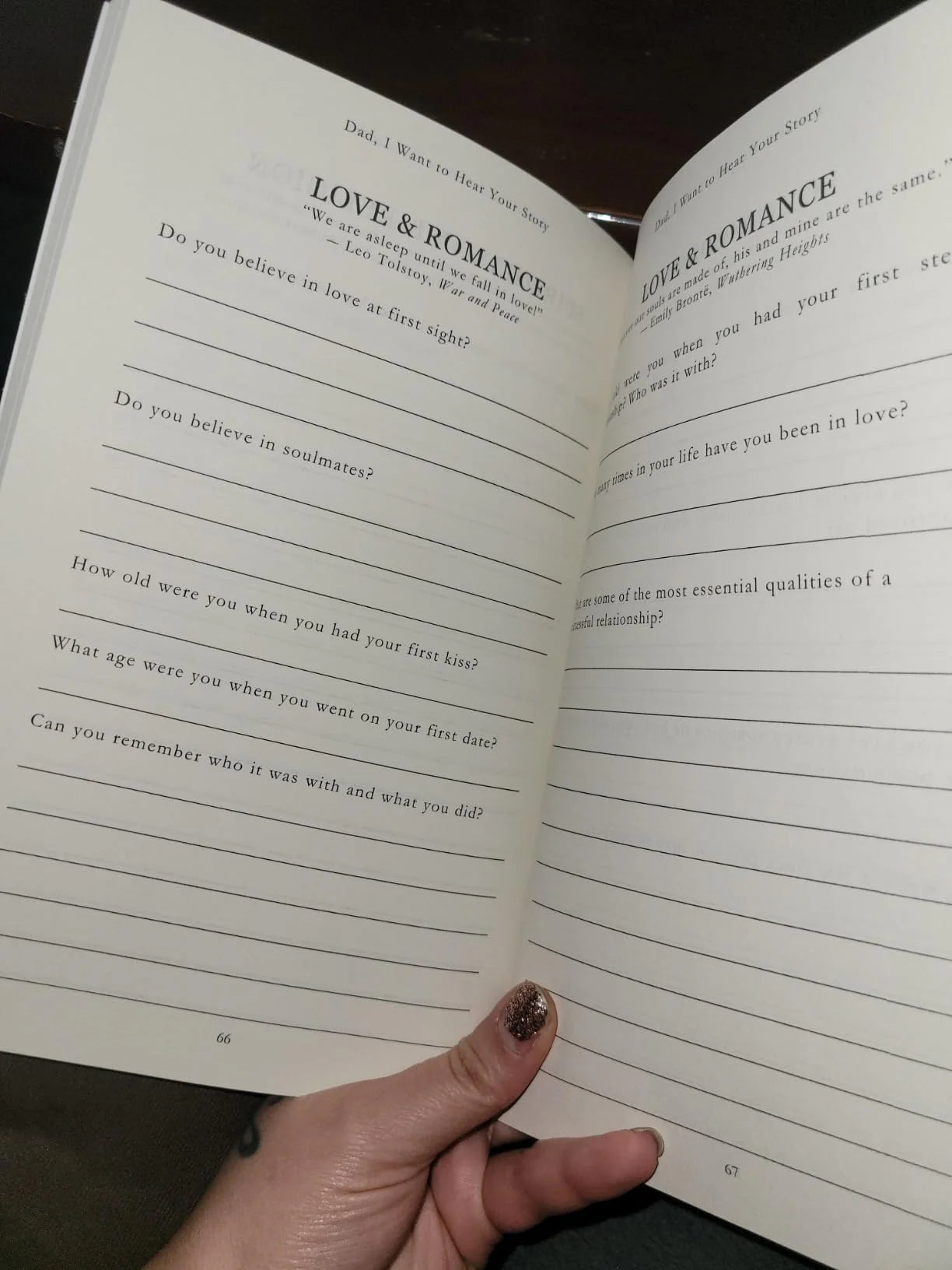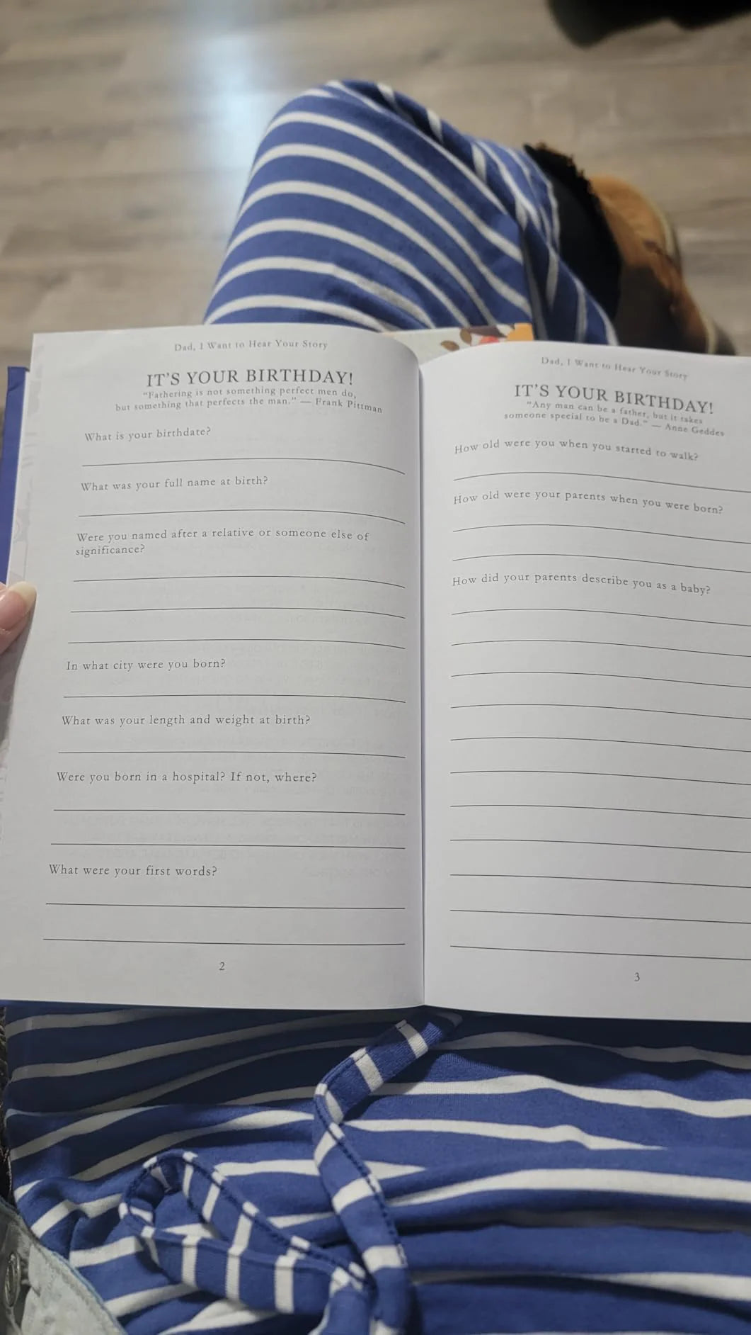Finally having real conversations with dad because of this book! Never talked to dad about his childhood til this journal came along. Now we discuss what he writes every week. Learning so much about him. The questions dig deep without being nosy.